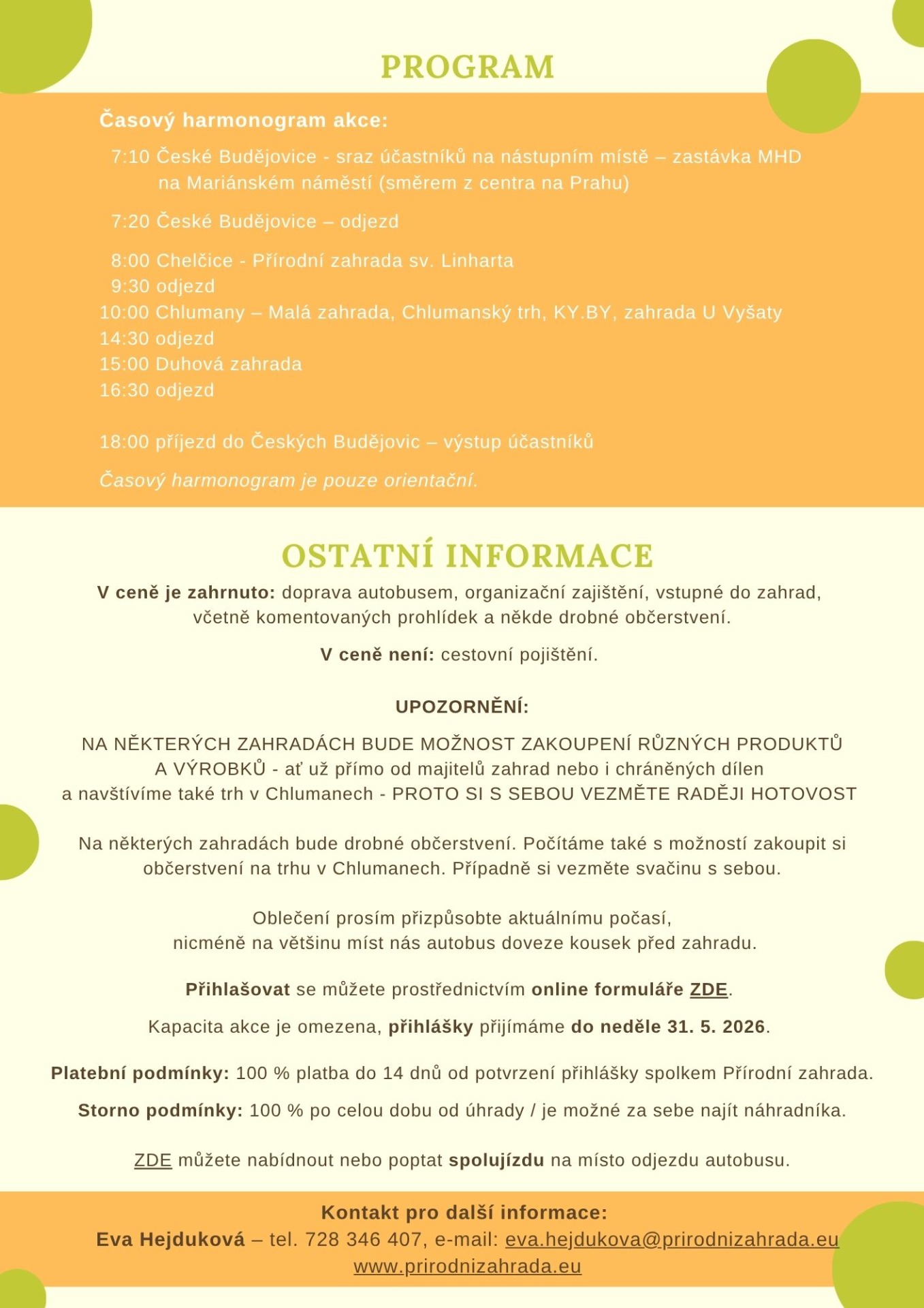 Platební podmínky: 100 % platba do 14 dnů od potvrzení přihlášky spolkem Přírodní zahrada.