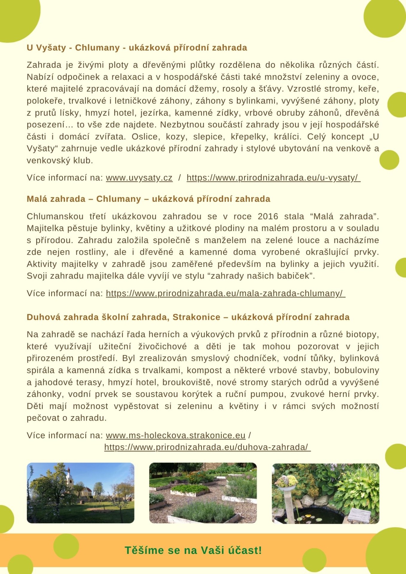 Čeká na nás zahrada v Chelčicích, Chlumanský trh, několik zahrad v Chlumanech a nakonec školní zahrada ve Strakonicích.